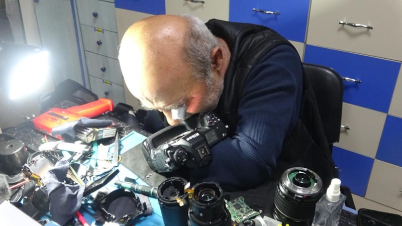 Tek kolu ile fotoğraf makinesi tamiri yapan Mehmet Akgün, 41 yıldır mesleğini sürdürürken dükkanında biriktirdiği fotoğraf makinelerini de sergiliyor.