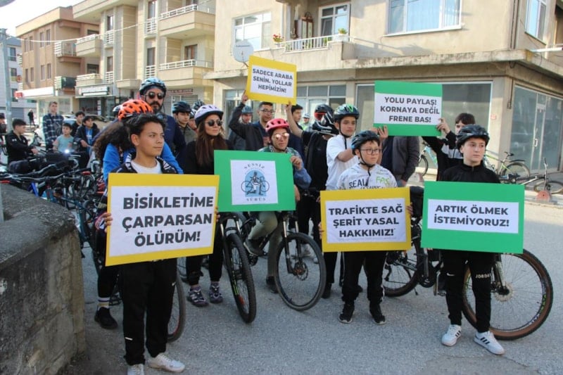 Açıklamanın ardından farkındalık oluşturmak için 2 bisikletli yola yattı. Yerdeki bisikletlilerin yanına pankartlarını ve bisikletlerini bırakan bisikletli grup, sürücülerin kendilerini de fark etmesini istedi.