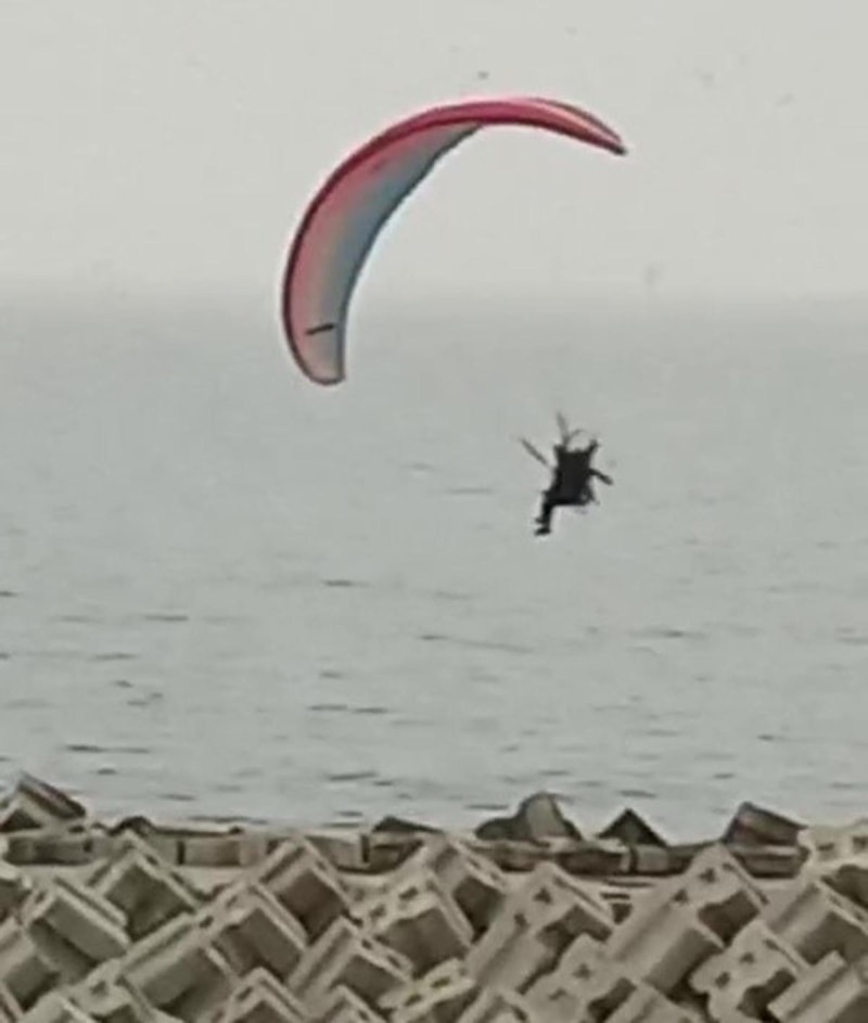 Bir süre denize düşmemek için çaba gösteren paramotor pilotu yakın mesafeden dalgakıranın üzerine düştü.