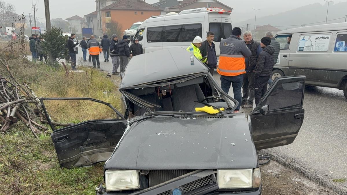 Gümüşova ilçesinde seyreden hafif ticari araç sürücüsü S.Y., Hürriyet Caddesi üzerindeyken ara sokaktan yola çıkan E.C.T. idaresindeki otomobille çarpıştı.