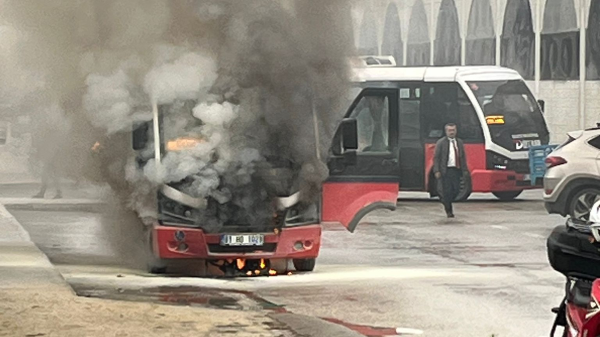 Aziziye Mahallesi Yeni Pazaryeri mevkiinde sabah saatlerinde, B.D. idaresindeki Düzce Belediyesi denetimli özel halk otobüsü, motor kısmından alev aldı.