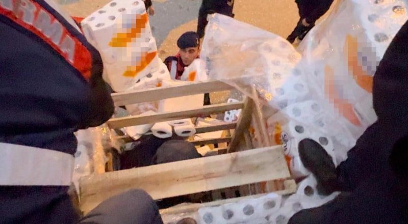 Tırın dorsesinde arama çalışması gerçekleştirildi. Ekipler, dorsede yüklü olan kağıt havlu paketlerini inceledi.