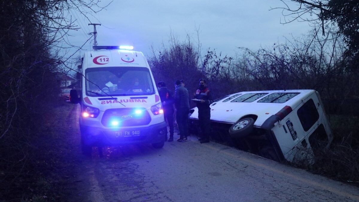 Düzce'nin Mollaoğlu köyünde Bahattin Sever'in kullandığı tekstil firmasına ait işçileri taşıyan 81 GD 034 plakalı minibüs, sürücünün direksiyon hakimiyetini kaybetmesi sonucu yol kenarına devrildi.