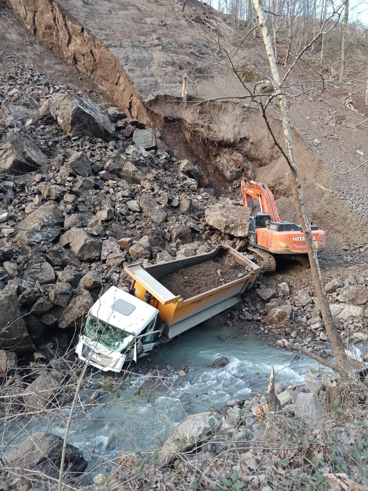 Heyelan nedeniyle kopan kaya ve toprak parçaları iş makinesi ile kamyonun üzerine düştü.