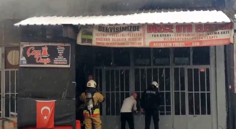 Düzce'de pazar günü sebebiyle kapalı olan sanayi çarşısı içerisinden geçen bir kişi kapalı olan klima ve çay ocağı dükkanının içinden siyah dumanların yükseldiğini fark etti.