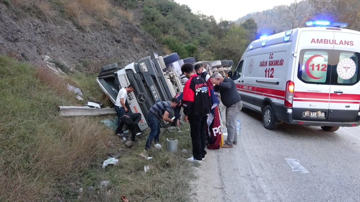 Düzce istikametine giden İbrahim Kırboğa idaresindeki 34 HA 3611 plakalı çimento yüklü silobas tır, sürücüsünün direksiyon hakimiyetini kaybetmesi sonucu yoldan çıkarak devrildi.