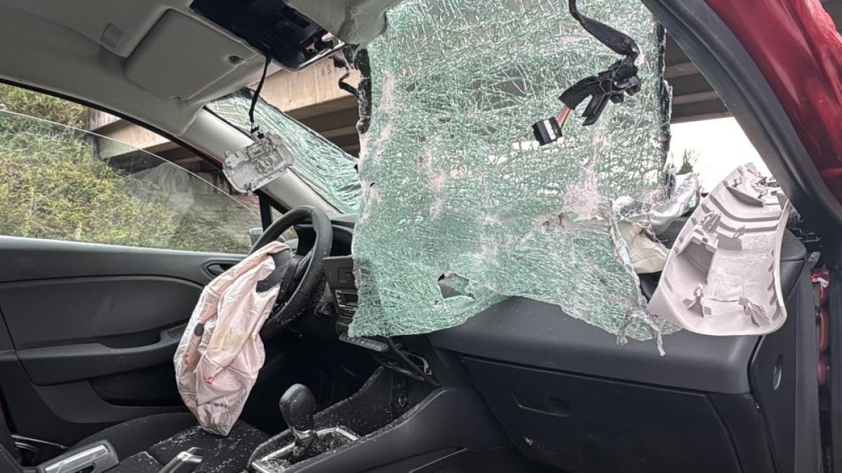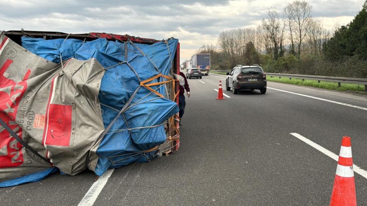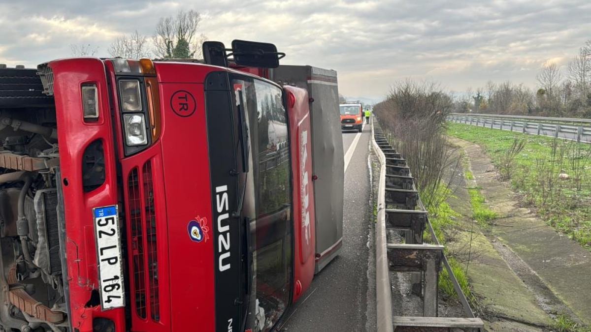 Çarpışmanın etkisi ile kamyon devrilirken, otomobil bariyerlere çarparak durabildi.