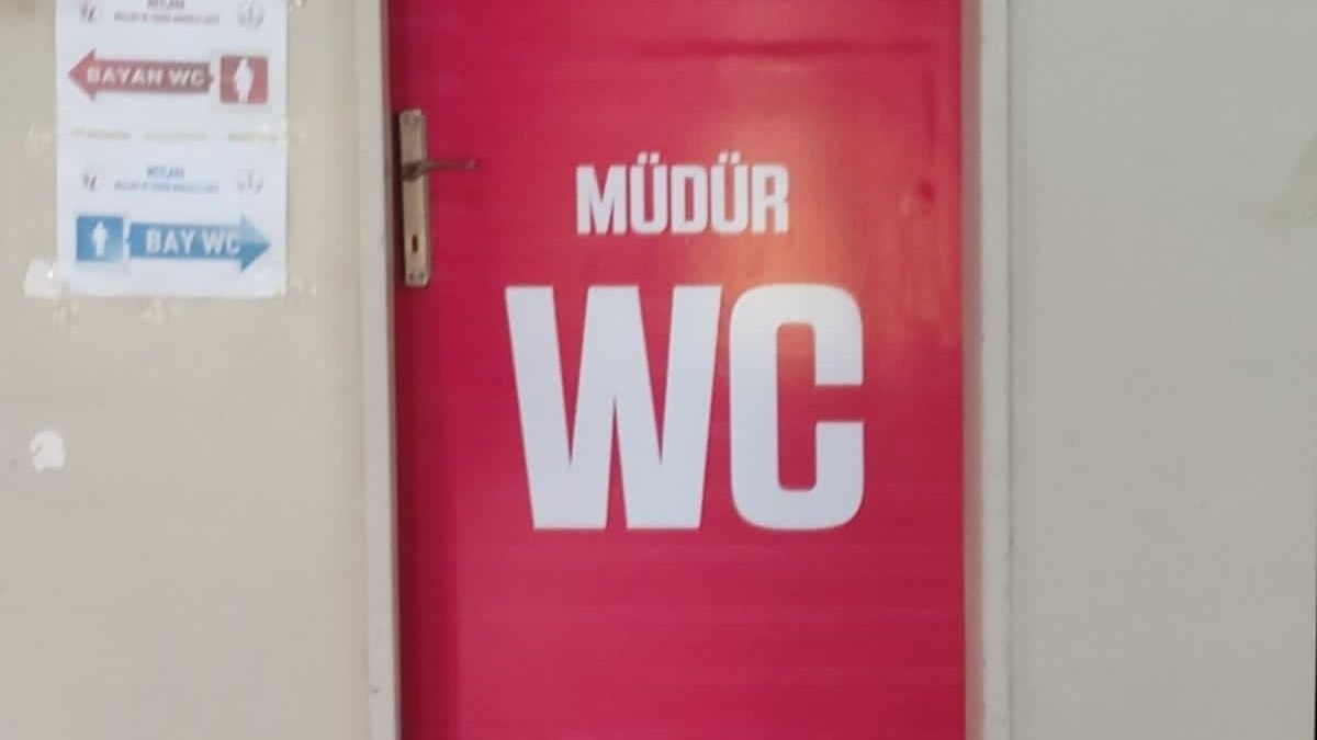 Düzce’de, Şıralık Mahallesi’ndeki Mevlana Teknik ve Anadolu Lisesi’nde, okul koridorunda pembe kaplama yapılan ve üzerinde 'WC Müdür' yazılı kapı, velilerin dikkatini çekti.