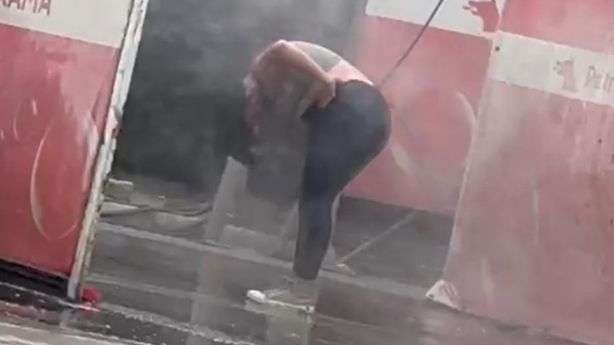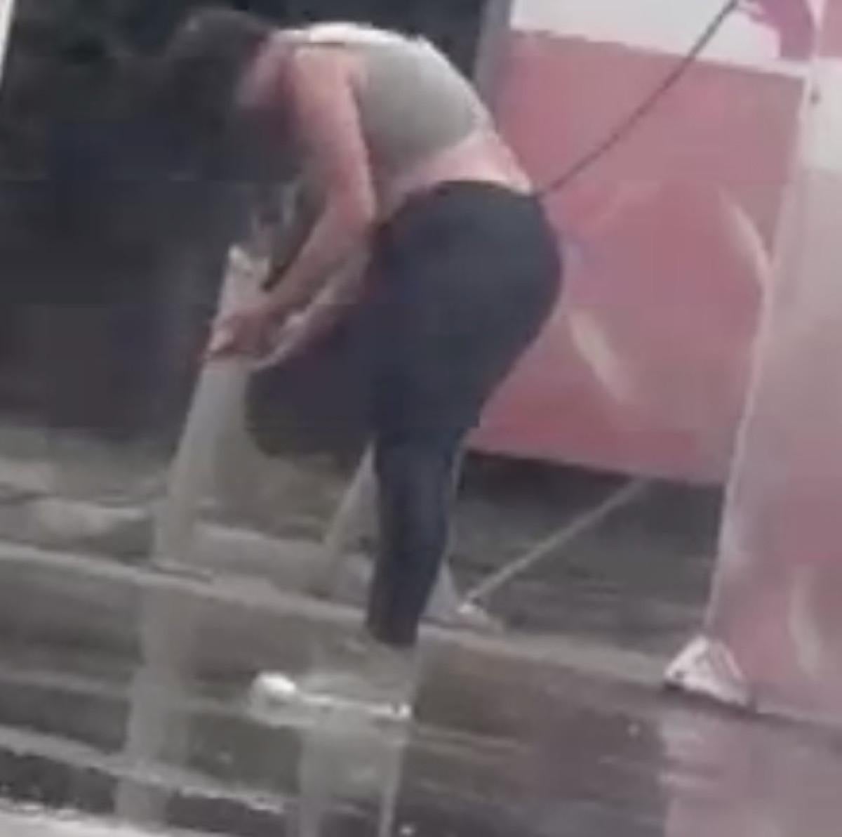 Dakikalarca tazyikli suyla yıkanan kadın sırılsıklam olurken, görenler şaşkınlıklarını gizleyemedi.