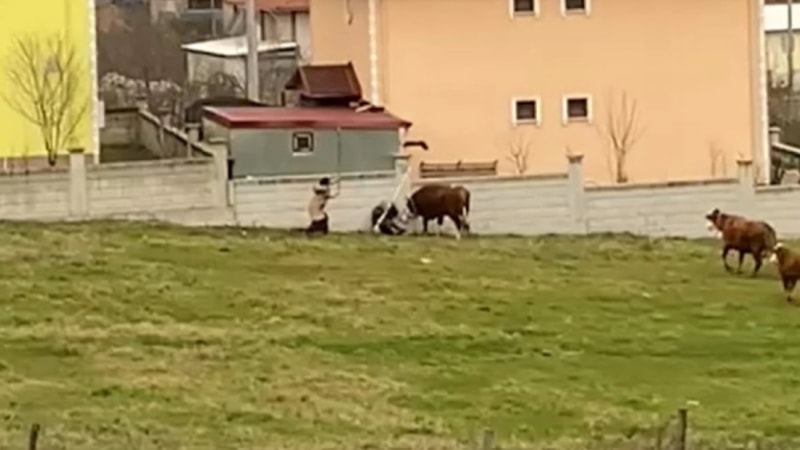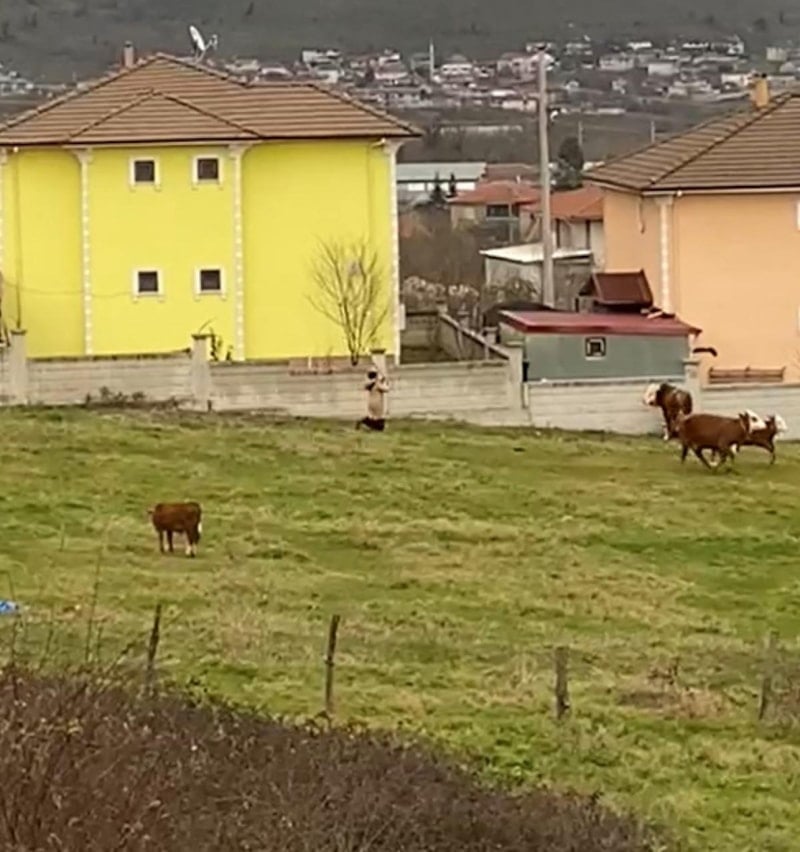 Koşarak giden kadın, elindeki sopayla hayvanları korkutarak besiciyi kurtardı. Olay anları cep telefonu kamerasıyla görüntülendi.