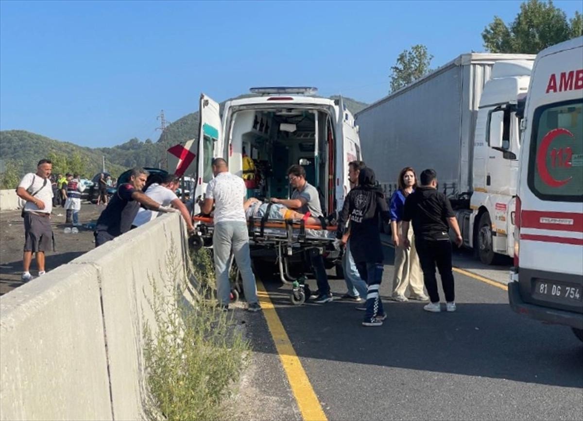 D-100 Karayolu Bolu Dağı Düzce geçişi Darıyeri Hasanbey mevkisinde seyir halindeki tır, frenlerinin boşalması sonucu önündeki 5 otomobile ve bir tıra arkadan çarptı.