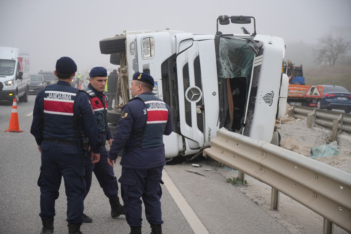 Edirne’de M.D. yönetimindeki 42 ABJ 033 plakalı kum yüklü hafriyat tırı, Edirne-Havsa yolunda sürücünün direksiyon hâkimiyetini kaybetmesi sonucu yan yattı. Dorsedeki kum yola saçılırken, kazanın önünde arızalanan bir araca çarpmamak için yapılan ani manevra nedeniyle meydana geldiği belirtildi.