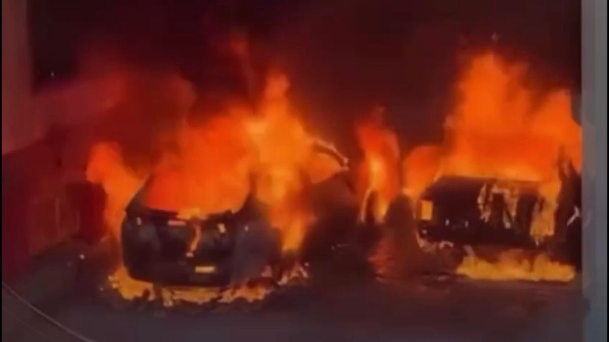 Yangında iki araç tamamen yanarak hurdaya dönerken, apartmanda maddi hasar meydana geldi.