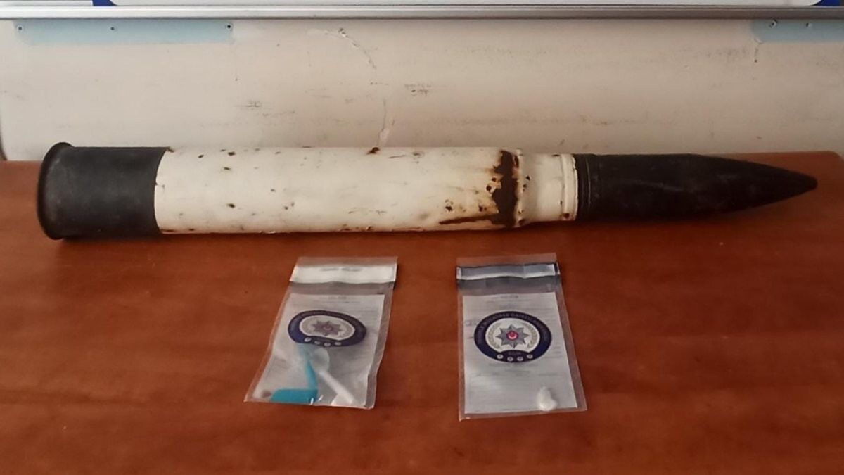 Evde yapılan aramada 84 santimetre uzunluğunda patlamamış havan topu mermisi ve bir miktar sentetik uyuşturucu ele geçirildi.