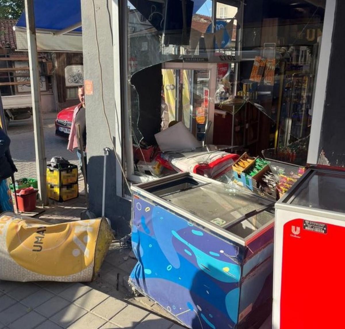 Araç, öncelikle karşıdan karşıya geçmek isteyen bir kadına çarptı ve ardından köşedeki marketin duvarına çarparak durabildi. Kaza sırasında marketin camı kırıldı ve içerideki ürünler yere devrildi.