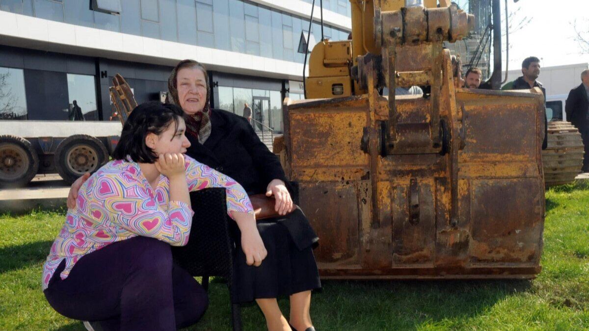 Görevlilerin faaliyetini görüp yeşil alana inen mahalleli Kıymet Peker (83), sandalyesiyle kepçenin önüne oturarak çalışmaları engelledi.
