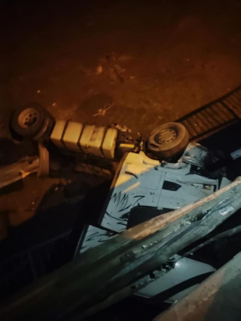 Edirne'nin Uzunköprü ilçesinde Sırbistan uyruklu sürücünün kullandığı tır, direksiyon hakimiyetinin kaybedilmesi sonucu yol üzerinde bulunan bariyerlerini yıkarak köprüden düştü.