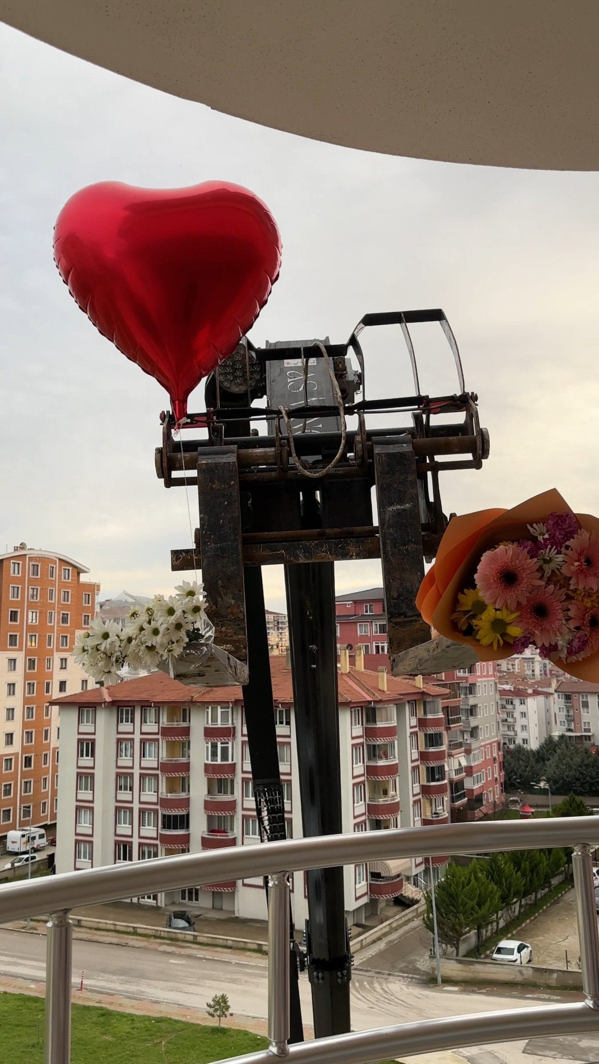 Gül buketi ve kalp şeklindeki balonu makinenin uzayan koluna bağlayan operatör, apartman önüne gelerek sürprizi başlattı.