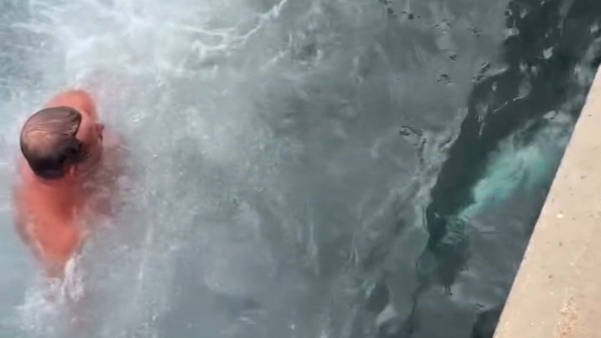 Edirne'de İbrice Limanı’nda deniz suyu sıcaklığındaki ani düşüş nedeniyle kıyıya vurduğu tahmin edilen orkinosu gören bir balıkçı hava sıcaklığının 3 derece olmasına aldırış etmeden üzerini çıkartarak, suya girdi.