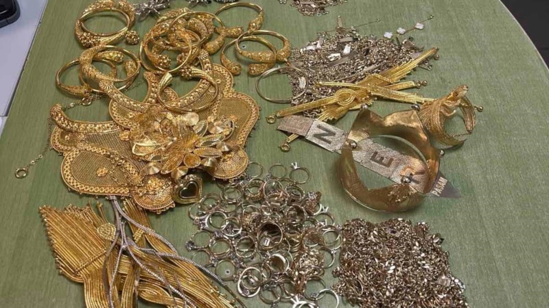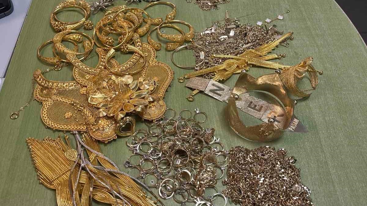 Zincir, bilezik, kolye, küpe, yüzük, madalyon, taç ve kravat iğnesi gibi çeşitli altın eşyaların toplam ağırlığının 1 kilo 241 gram olduğu, yaklaşık 115 bin euro değerinde bulunduğu belirlendi.
