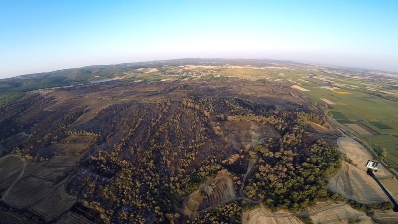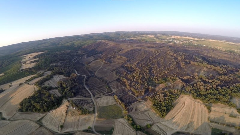 Edirne'nin Keşan ilçesinde çıkan orman yangınında zarar gören alanlar havadan görüntülenirken, ormanın tamamen yanarak siyaha büründüğü görüldü.