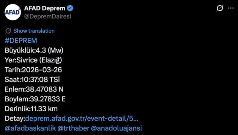 Elazığ Valiliği'nden yapılan açıklamada, Sivrice ilçesinde meydana gelen 4.3 büyüklüğündeki depremle ilgili, "İçişleri Bakanlığı (AFAD) Afet ve Acil Durum Yönetimi Başkanlığı'ndan alınan bilgiye göre; Sivrice ilçemizde 26/03/2026 tarihinde saat 10:37'de 4.3 MW büyüklüğünde deprem meydana gelmiştir.
