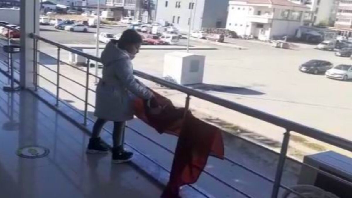 Hemen bölgeye koşan küçük kız, ters dönen bayrağı düzeltti. Ardından bayrağı öpüp başına koydu.