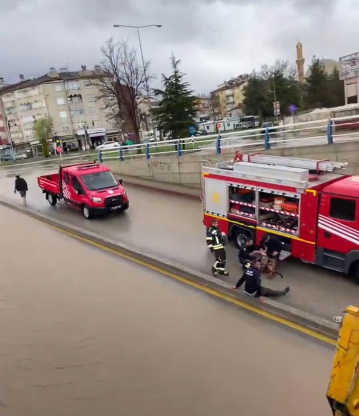 Suyun ortasında kalan sürücünün yardım çağrısı üzerine itfaiye ekipleri hızla bölgeye sevk edildi.
