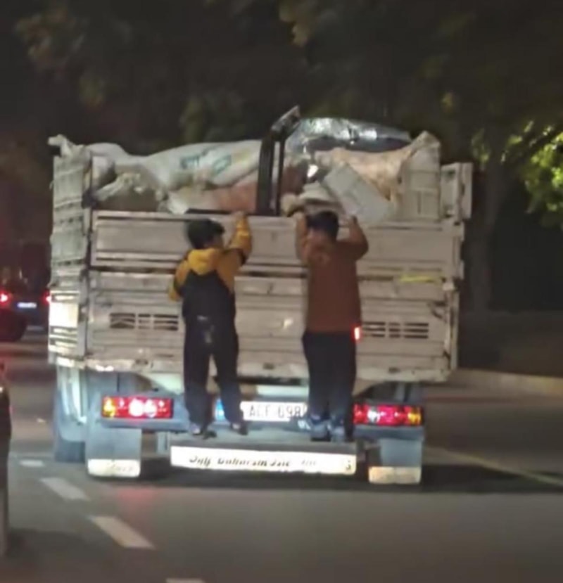 2 çocuğun seyir halindeki kamyonetin arkasına asılarak gittiği anlar cep telefonu kamerasına yansıdı.