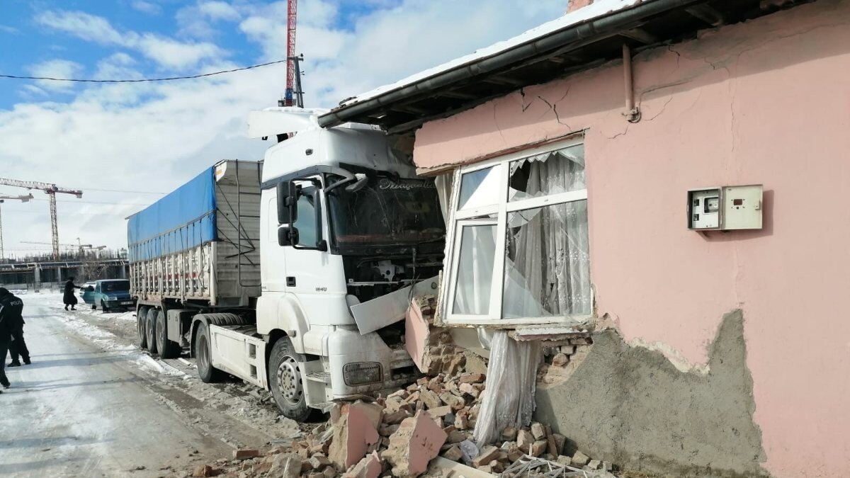 Elazığ'ın Sürsürü Mahallesi'ne bağlı Lami Karaağaç Sokak'ta rampa aşağı inen Mehmet Ç. yönetimindeki 21 HB 464 plakalı tır, kar nedeniyle kayganlaşan yoldan çıkarak tek katlı müstakil eve çarptı.