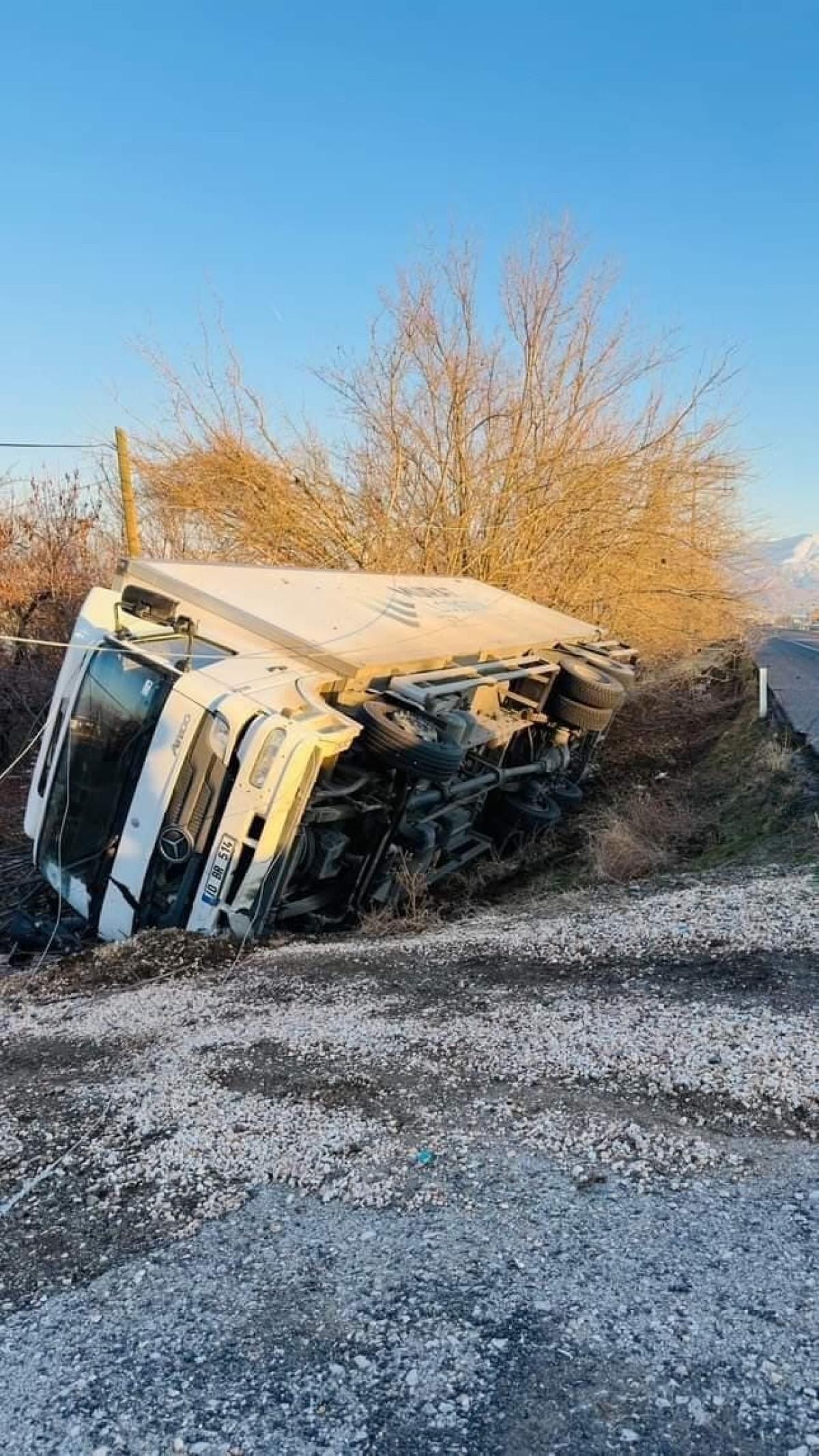 Elazığ'ın Yazıkonak beldesinde meydana gelen olayda, sürücüsünün direksiyon hakimiyetini kaybettiği 10 BR 514 plakalı kamyon, yoldan çıkıp yan yattı.