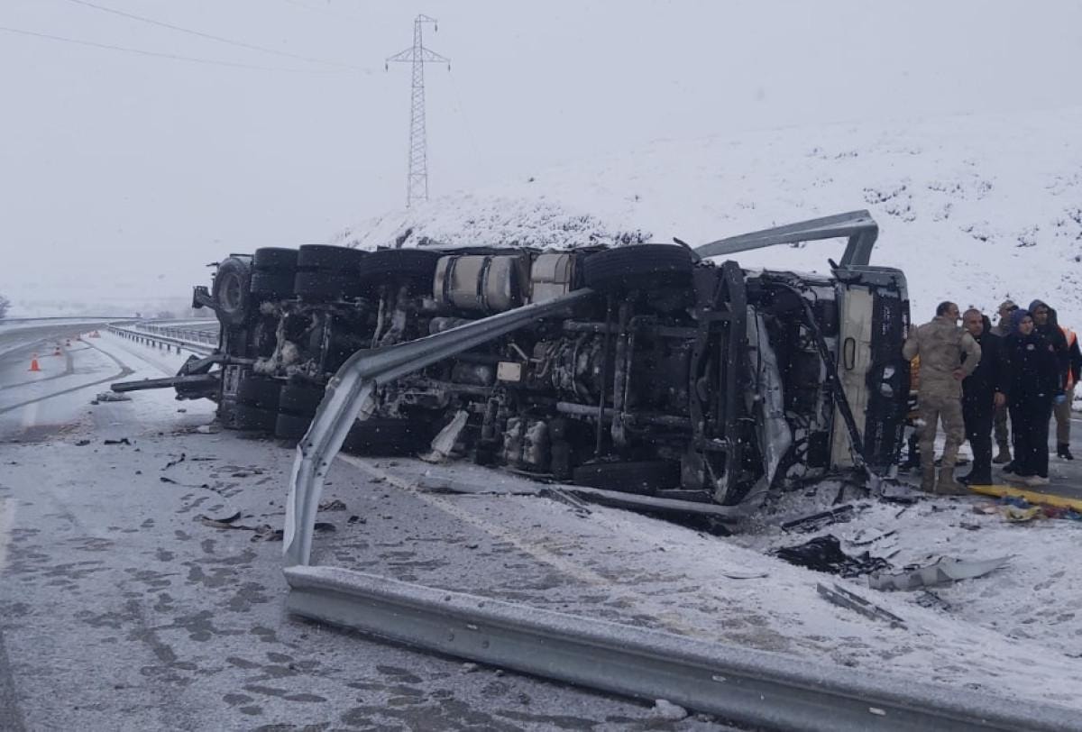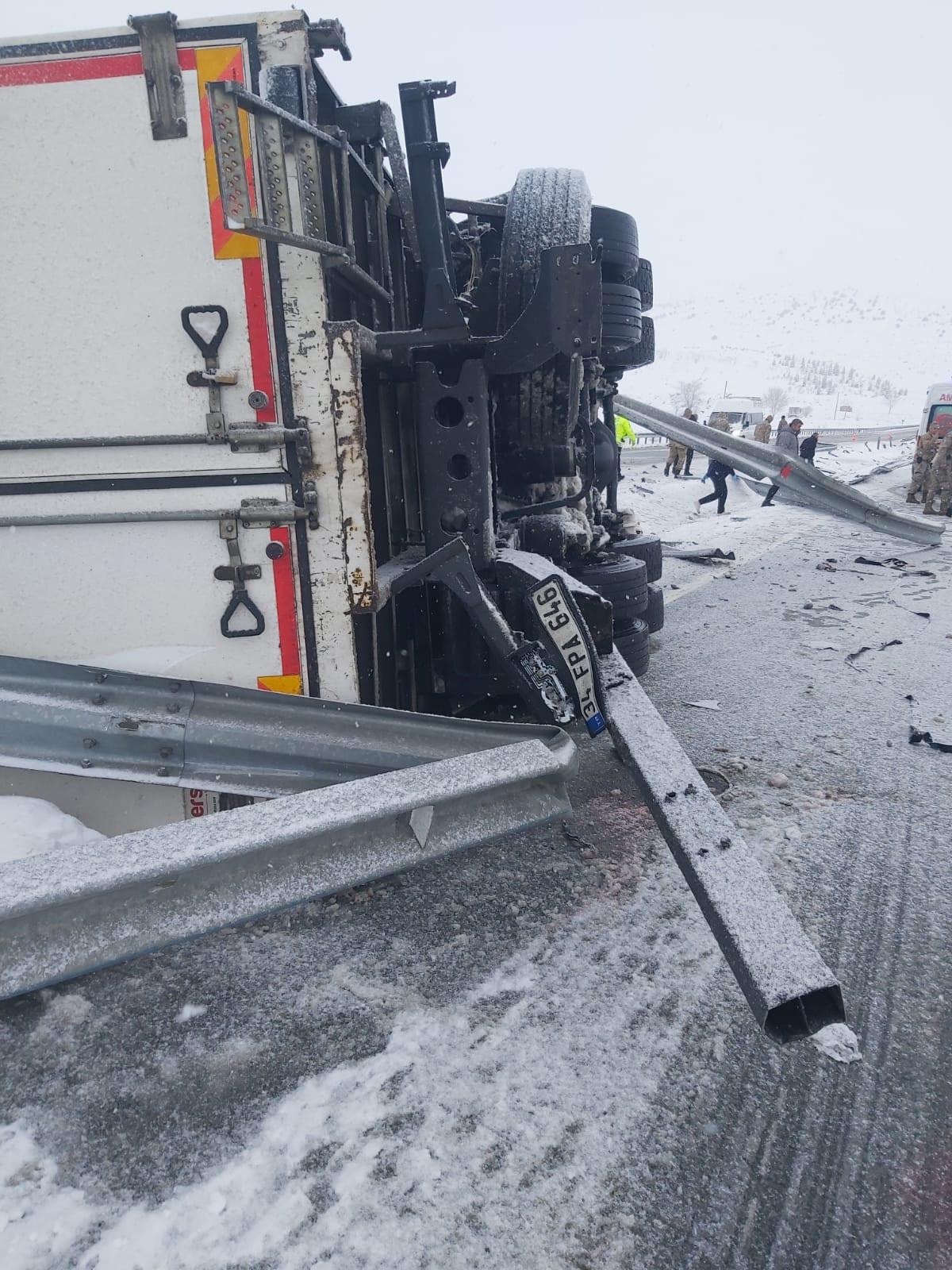 Kontrolden çıkan kamyon, yola devrilerek çelik bariyerlere çarptı.