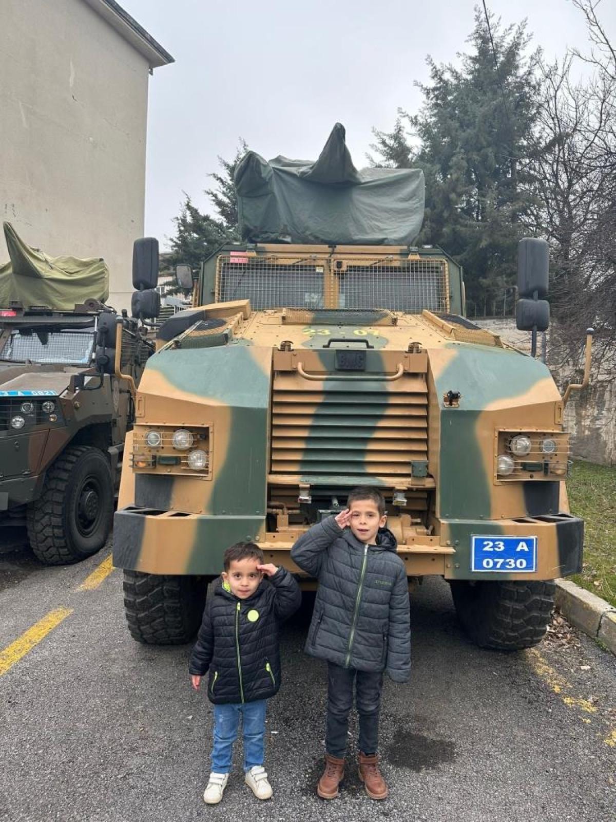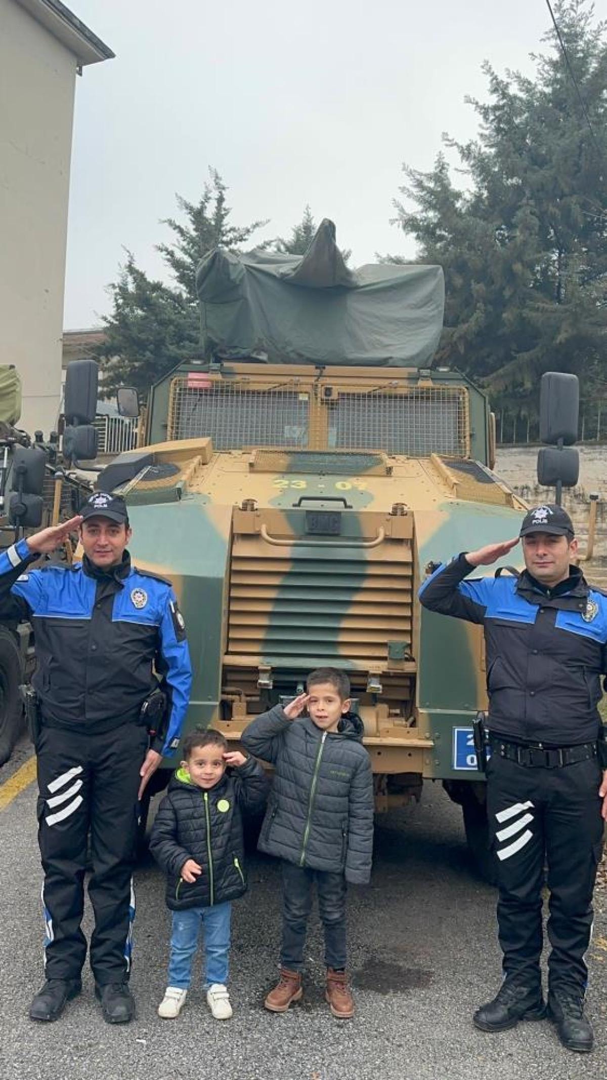 Çocuklar, şube müdürlüğüne ait zırhlı araçlara bindirildi.