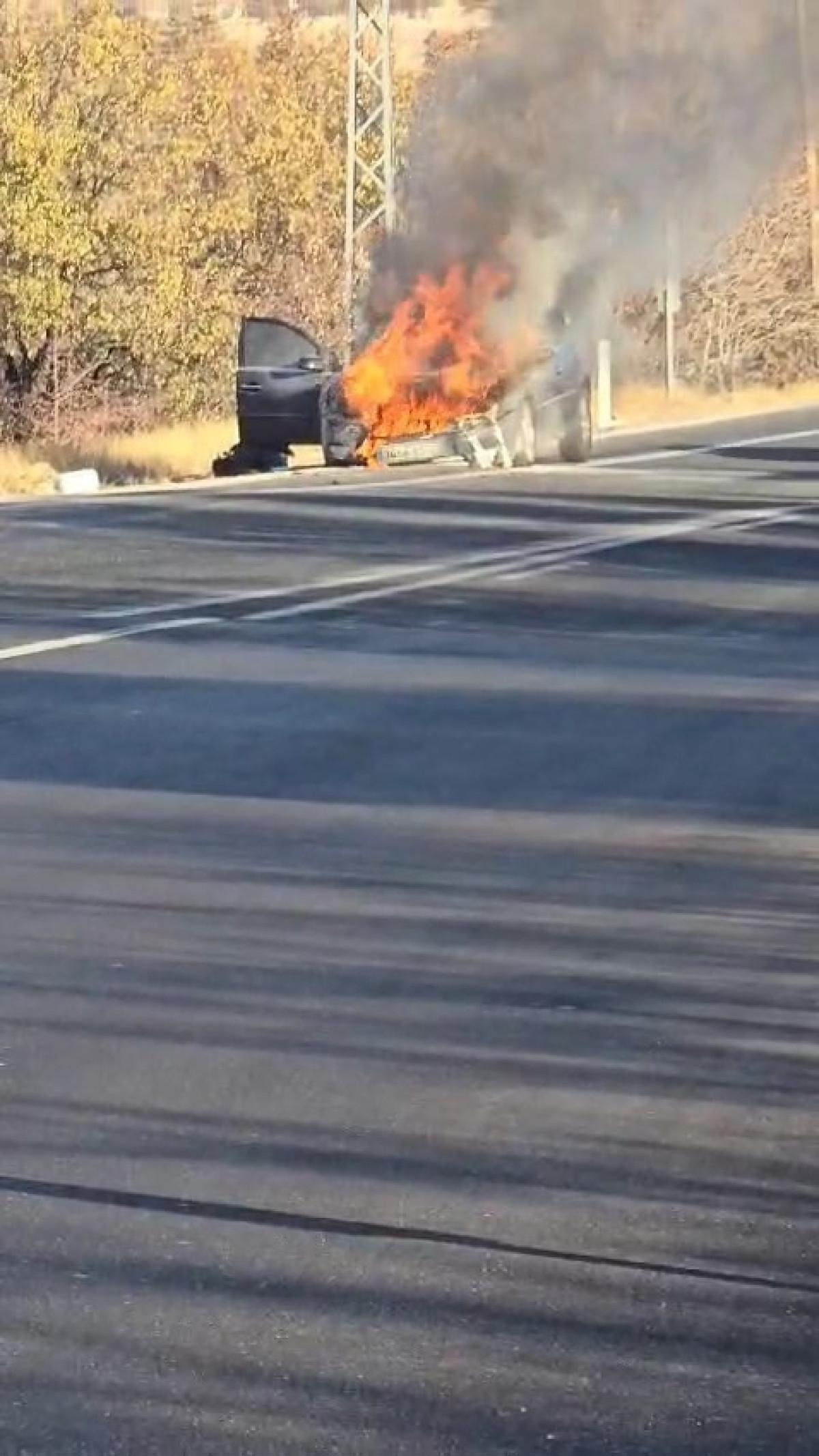 Elazığ-Pertek kara yolu üzerinde seyreden bir otomobil, henüz bilinmeyen bir nedenle alev aldı.