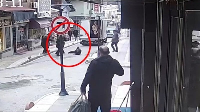 Şüphelinin yaralıyı tekmelemeye çalıştığı anlar, çevredeki iş yerinin güvenlik kamerasına yansıdı.