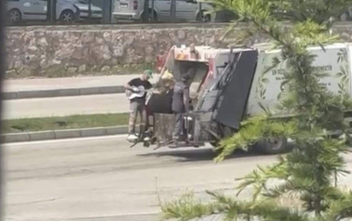 Gitarı eline alan personel, çöp arabasının arkasına geçerek gitarla ritim tutmaya başladı.