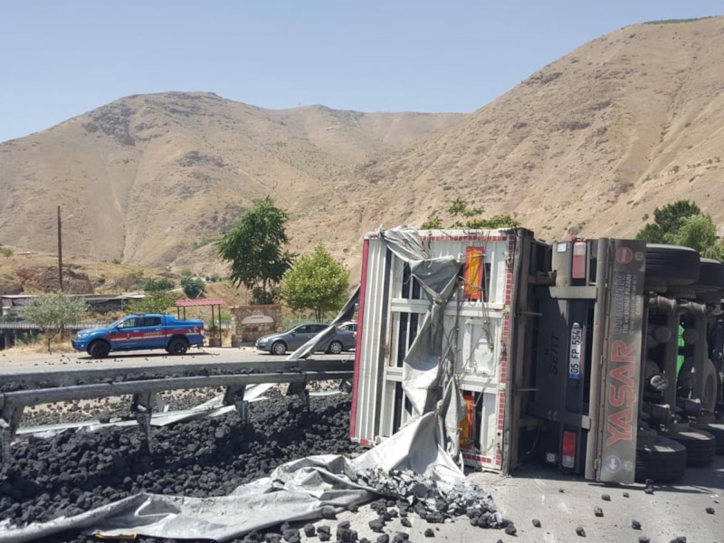 Elazığ'da Keban-Ağın-Arapgir karayolu Fırat köprüsü mevkiinde Arapgir istikametinden Keban istikametine seyir halinde olan M.E. idaresindeki kömür yüklü kamyon, Keban Köprüsü mevkiinde virajı alamayarak devrildi.