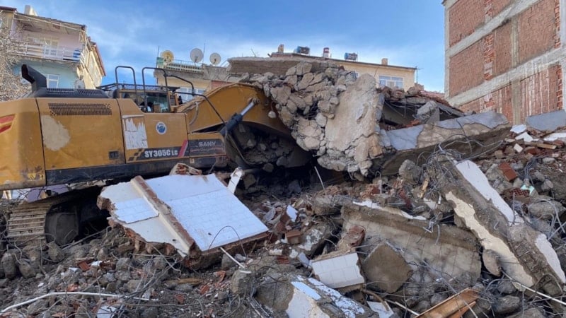 Elazığ’da 6 Şubat 2023 depremlerinde ağır hasar alan bir binanın yıkımı sırasında binanın bir bölümü iş makinesinin üzerine devrildi. Olayda yaralanan olmazken, iş makinesinin bir kısmı enkaz altında kaldı.