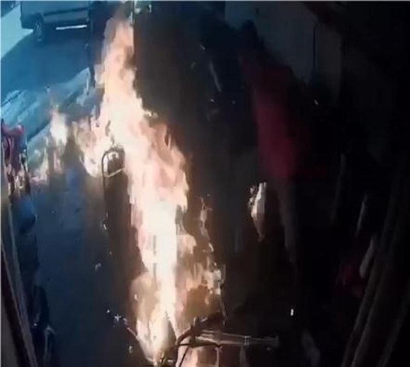 Tamir sırasında motosiklette çıkan yangına yanlışlıkla yanıcı maddeyle müdahale eden 2 kişi alevlerin arasında kaldı. Yaralanan olmazken, olay güvenlik kamerasına yansıdı.