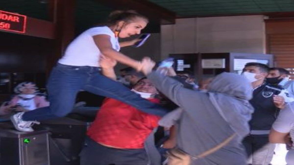 Tartışma kısa sürede kavgaya dönüştü. Kadınlardan biri, turnike üzerine çıkarak tartıştığı kadına uçan tekme attı. İskeledeki güvenlik görevlileri kavgayı ayırdı.