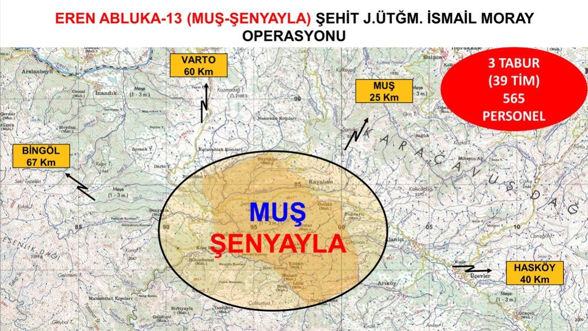 İçişleri Bakanlığı, Muş’ta 565 personelin katılımıyla Eren Abluka-13 Şehit Jandarma Üsteğmen İsmail Moray Operasyonu'nun başlatıldığını duyurdu.