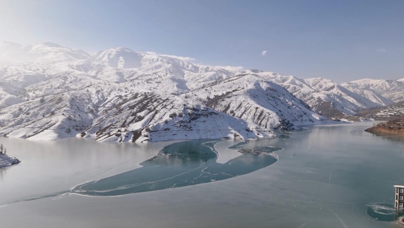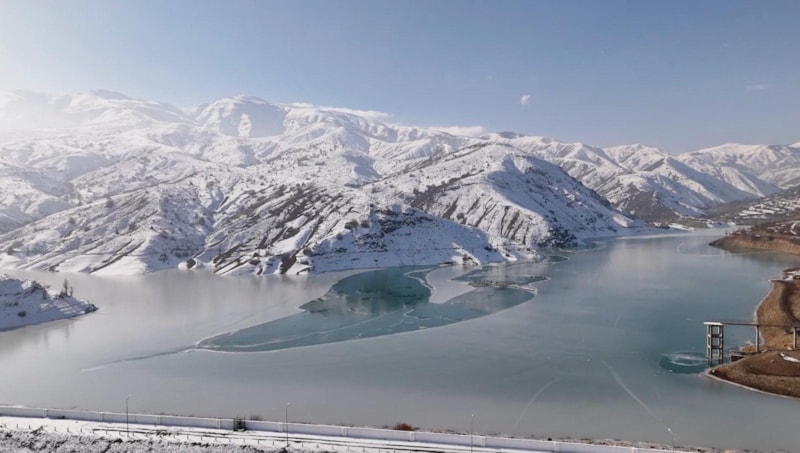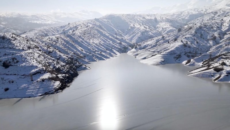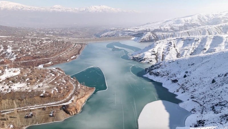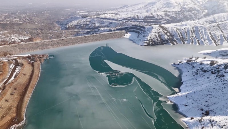 Erzincan Çatalarmut köyünde DSİ tarafından inşa edilen ve tarım arazilerinin sulanmasında kullanılan, aynı zamanda kafes balıkçılığı da yapılan Göyne Baraj gölünün yüzeyi buz tuttu.