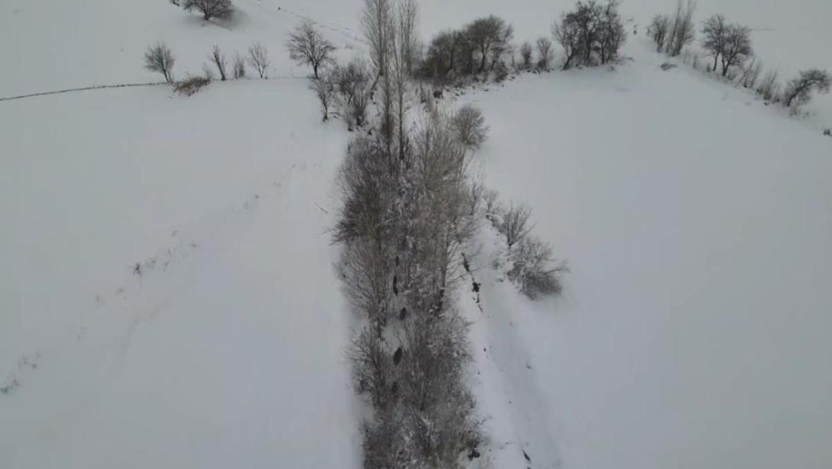 Mert Yılmaz, bu seferde karla kaplı arazide domuz sürüsünü drone ile görüntüledi. Bir yandan koyun sürüsünü otlatırken diğer yandan da karlı arazide domuz sürüsünü havadan görüntüledi.