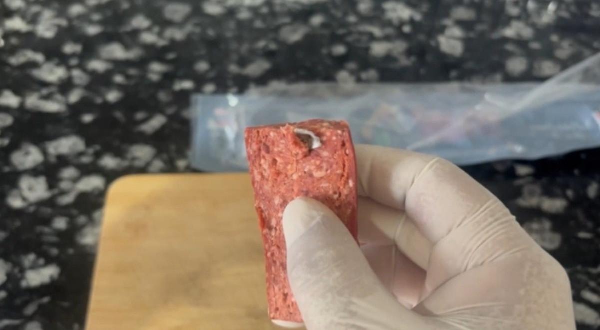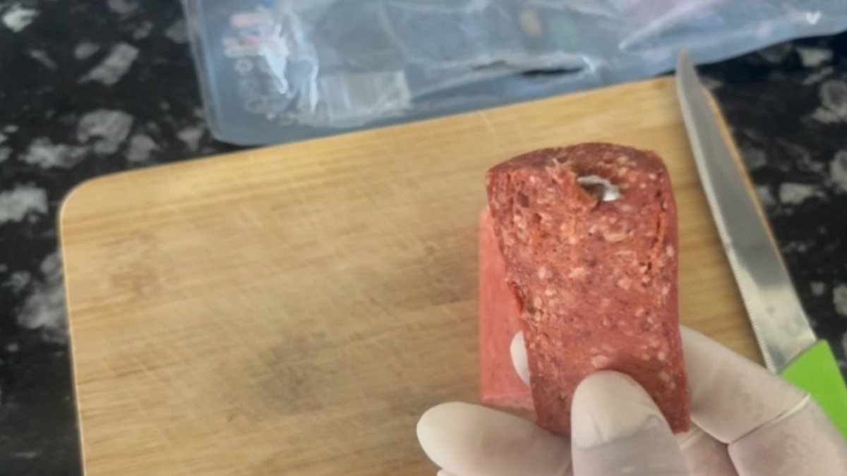 Görüntülerde, sucuğun içindeki yabancı cisim net şekilde görülüyor.