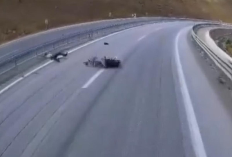 Görüntülerde, virajda motosikletin bariyerlere çarparak yola savrulduğu anlar görüldü.