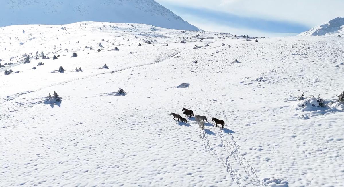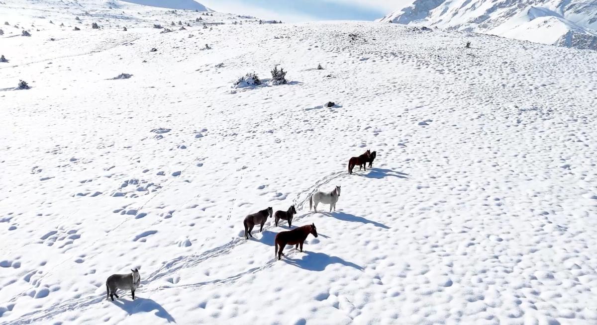 Karla kaplı bölgede sürü halinde gezen yılkı atları, güzel görüntüler oluşturdu.