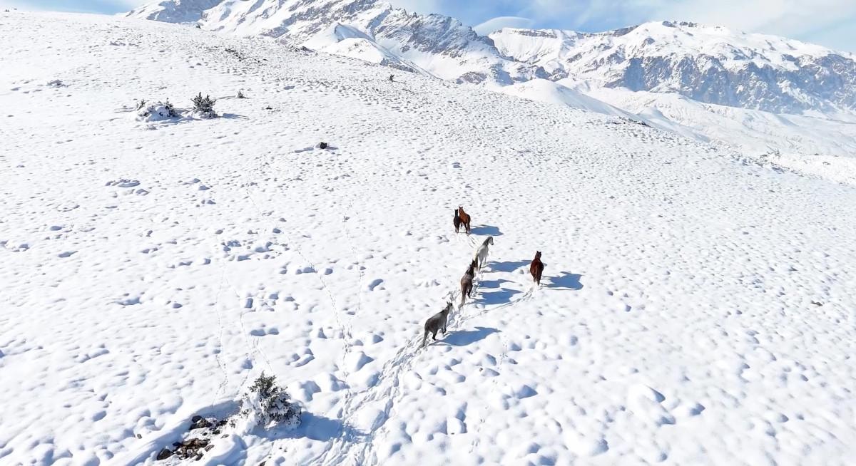 Sürü halinde dolaşıp, yiyecek arayan yılkı atları, Doğa Koruma ve Milli Parklar Erzincan Şube Müdürlüğü ekipleri tarafından drone ile görüntülendi.