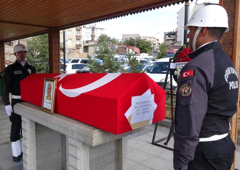 Erzurum'da aort damarı yırtılan ve kaldırıldığı hastanede hayatını kaybeden 51 yaşındaki trafik polisi Selçuk Durmaz, meslektaşları tarafından son yolculuğuna uğurlandı..