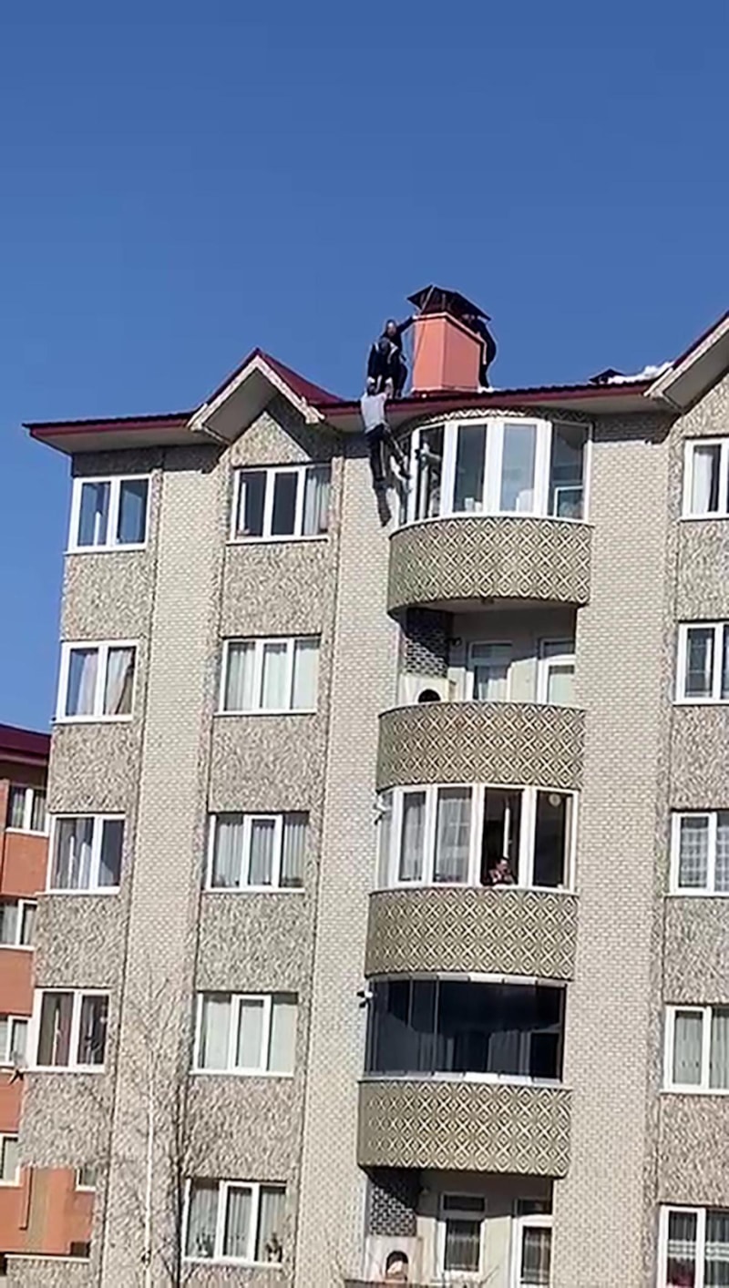 Belindeki iple çatıda asılı kalan Ergün'ün yardımına, o sırada bölgeden geçenler koştu.