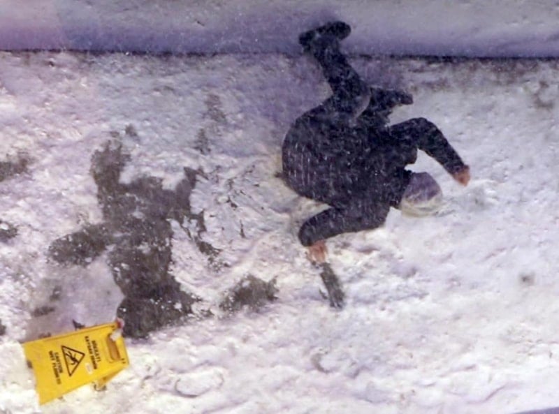 Art arda düşme olaylarının yaşanması nedeniyle duyarlı bir kişi, kaygan zemine karton kutu serip, bir iş yerinden aldığı 'Dikkat kaygan zemin' tabelasını bıraktı.